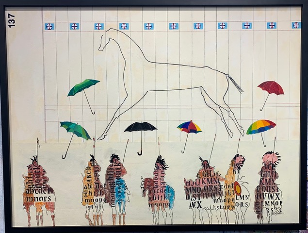 In his narrative paintings and mixed media works, Bailey decontextualizes the white man’s staged “historic” photographs of Native Americans, samples the work of artists from Europe, the U.S. and Indian Country, and repurposes comic books and advertisements. Bailey juxtaposes those images with landscapes he knows and has imagined, and like the basket makers from his Hoopa Valley home, he weaves the varied strands together. Then he asks his viewer, “whil-xolik: tell me a story.”